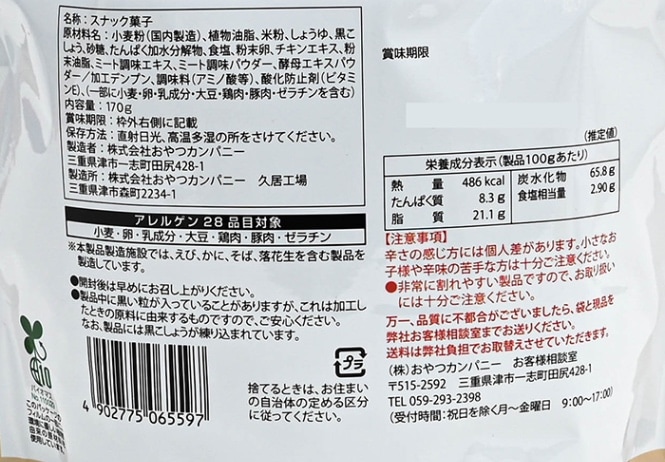 製造工場ではえび、かに、そば、落花生を含む製品も製造しています