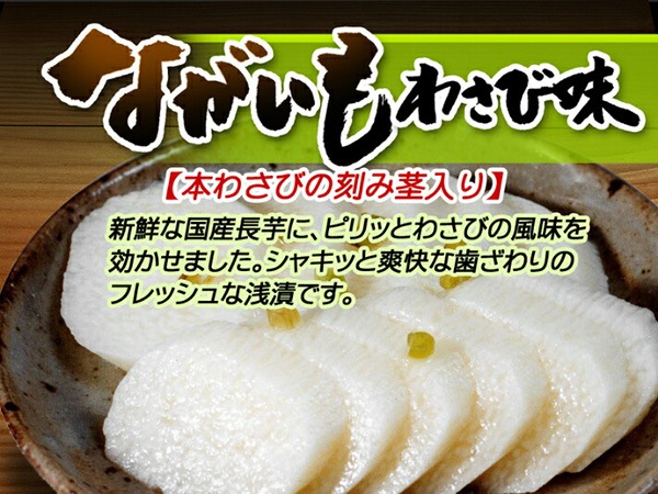 安心安全で人にやさしく、定番の長いもの浅漬けわさび味です。