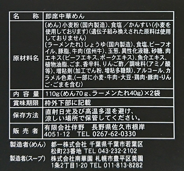 [ラーメンたれ]しょうゆ(国内製造)、食塩、ビーフオイル、豚脂、牛肉(信州牛)、玉葱、異性化液糖、砂糖、肉エキス(ビーフエキス、ポークエキス)、魚介エキス、植物油脂、ごま、香辛料、りんご酢/調味料(アミノ酸等)、増粘剤(加工でん粉、増粘多糖類)、アルコール、カラメル色素、(一部に小麦・牛肉・大豆・鶏肉・豚肉・りんご・ごまを含む)