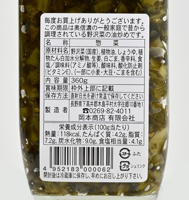 原材料/野沢菜(国産)、植物油、しょうゆ、植物たん白加水分解物、生姜、白ごま、香辛料、食塩/調味料(アミノ酸等)、酸味料、酸化防止剤(ビタミンE)、(一部に小麦・大豆・ごまを含む)