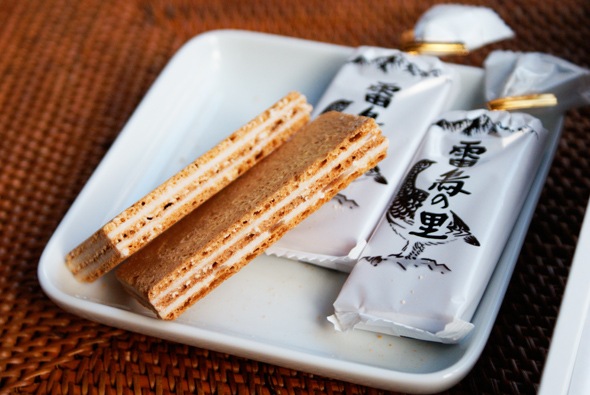 北アルプスを象徴する鳥"雷鳥"の名をいただいた欧風焼き菓子「雷鳥の里」。欧風せんべいにクリームをサンド。サクッとした食感と軽やかなおいしさが人気のお菓子です。お茶菓子として、コーヒー、緑茶なんでも合います。