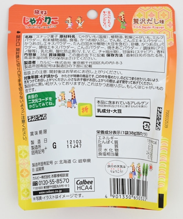 原材料/じゃがいも(国産)、植物油、乾燥じゃがいも、ミルクパウダー、粉末植物油脂、食塩、かつお削りぶし、でん粉、こんぶエキスパウダー、かつおぶしエキスパウダー、たん白加水分解物(大豆を含む)、砂糖、かつおぶしパウダー、酵母エキスパウダー、こんぶパウダー、焼きあごパウダー/調味料(アミノ酸等)、乳化剤、酸化防止剤(V.E、V.C、チャ抽出物)、甘味料(ステビア)、香料