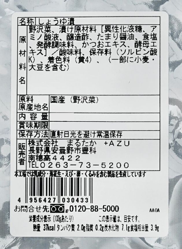 野沢菜、漬け原材料(異性化液糖、アミノ酸液、醸造酢、たまり醤油、食塩、発酵調味料、かつおエキス、酵母エキス)/酸味料、保存料(ソルビン酸K)、着色料(黄4)、(一部に小麦、大豆を含む)