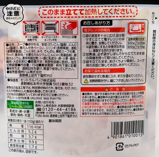 原材料/野菜(だいこん(国産)、にんじん(国産))、無えんせきベーコン、エリンギ(長野県産)、酒粕(長野県製造)、こんにゃく、みそ、でんぷん、顆粒スープの素、ラード、香辛料/水酸化カルシウム(こんにゃく用凝固剤)、卵殻カルシウム、香辛料抽出物、(一部に乳成分、卵、小麦、豚肉、鶏肉、大豆を含む)