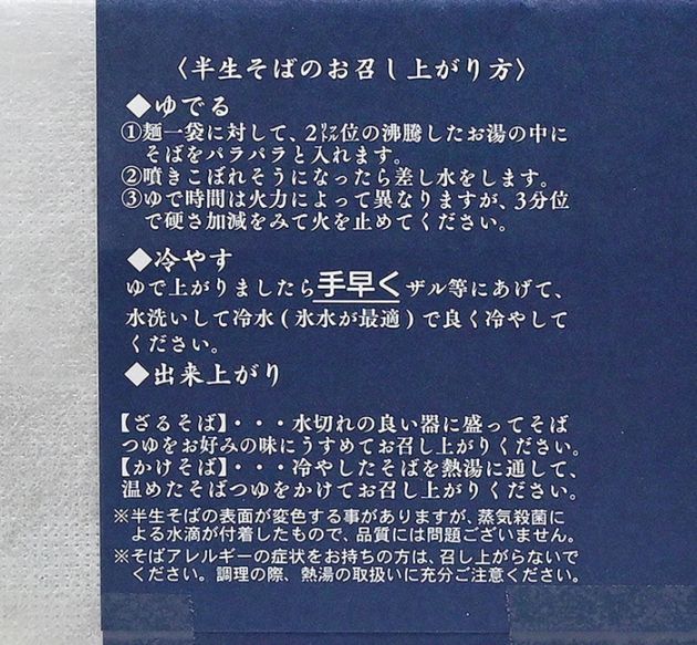 原材料/「めん」そば粉(国内製造)、小麦たん白、小麦粉、食塩/加工でん粉(打粉)、増粘多糖類、pH調整剤、 「つゆ」しょうゆ(国内製造)、砂糖混合異性化液糖、食塩、かつおぶし(粗砕)/調味料(アミノ酸等)、ビタミンB1、(一部に小麦、大豆を含む)