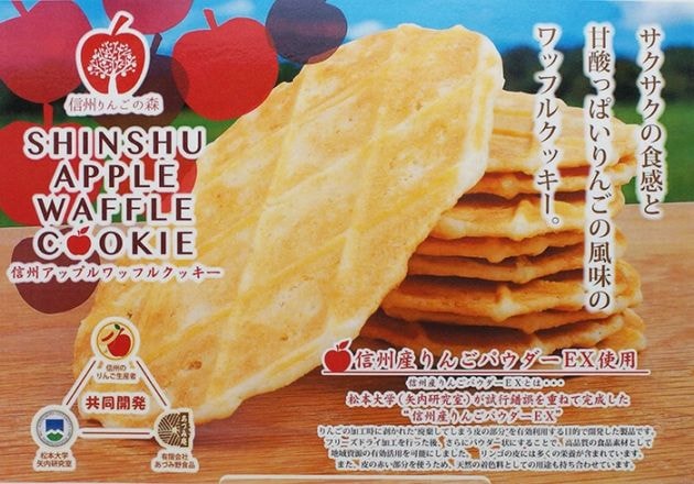 信州産りんご100%使用。サクサクの食感と甘酸っぱいりんごの風味の信州りんごワッフルクッキー。信州のりんごの生産者と松本大学(矢内研究室)、有限会社あずみ野食品による共同開発商品です