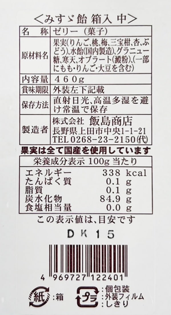 原材料/果実(りんご、桃、梅、三宝柑、杏、ぶどう)、水飴(国内製造)、グラニュー糖、寒天、オブラート(澱粉)(一部にもも・りんご・大豆を含む)