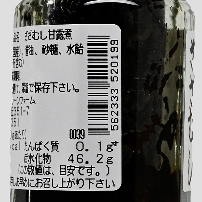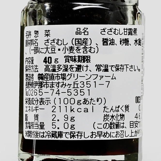 | 原材料 | ざざむし、砂糖、しょうゆ、水アメ、(原材料に大豆、小麦を含む) |