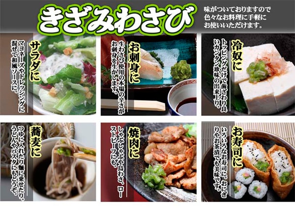 きざみわさびは味が付いておりますので魚料理や肉料理に直接つけてお召し上がり下さい
