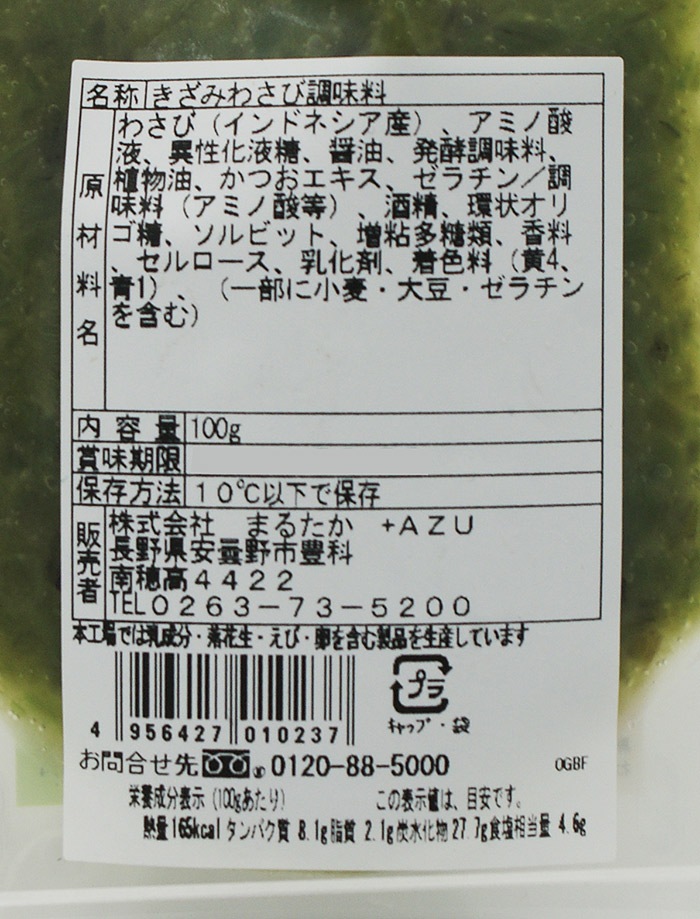 原材料/わさび、アミノ酸液、異性化液糖、醤油、発酵調味料、植物油、かつおエキス、ゼラチン、調味料(アミノ酸等)、酒精、環状オリゴ糖、ソルビット、増粘多糖類、香料、セルロース、乳化剤、着色料(黄4、青1)、(一部に小麦、大豆、ゼラチンを含む)