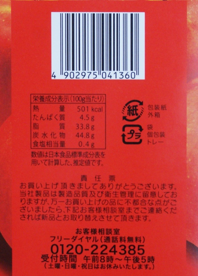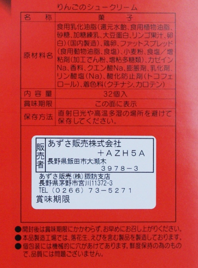 | 原材料 | 食用乳化油脂(植物油脂、還元水飴、加糖練乳、砂糖、リンゴ果汁、卵白、その他)、鶏卵、ファットスプレッド(食用動物油脂、食塩)、小麦粉、食塩、増粘剤(加工澱粉、増粘多糖類)、香料、カゼインNa(乳由来)、乳化剤、クエン酸Na、膨張剤、着色料(カロチン)、リン酸塩(Na)酸化防止剤(トコフェロール)、(原材料の一部に大豆を含む) 製造工場では落花生、えびを含む製品も製造しています。 |