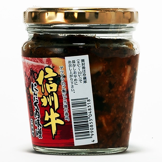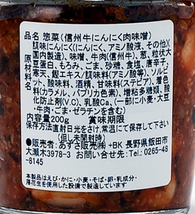 | 原材料 | にんにく、味噌、牛肉、葱、粒状大豆蛋白、アミノ酸液、もろみ、胡麻、砂糖、食塩、唐辛子、寒天、鰹エキス、調味料(アミノ酸等)、ソルビット、酸味料、酒精、甘味料(ステビア)、着色料(カラメル、パプリカ色素)、増粘多糖類、酸化防止剤(V.C)、乳酸Ca、ビタミンB1、保存料(ポリリジン)、(原材料の一部に小麦、大豆を含む) 製造工場では卵、小麦、乳、そば、かに、えびを使用した製品も製造しています。 |