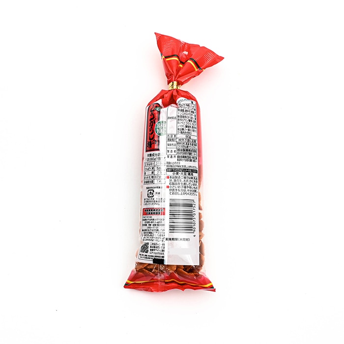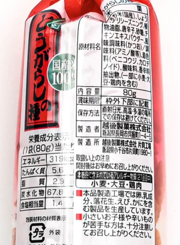 | 原材料 | うるち米(国産)、醤油(大豆、小麦を含む)、チリシーズニング(鶏肉を含む)、植物油脂、唐辛子、砂糖、チキンエキスパウダー、風味調味料(かつお)、調味料(アミノ酸等)、着色料(ベニコウジ、カロチノイド)、酸味料、香辛料抽出物 製造工場では卵、乳、落花生、えび、かにを含む製品も製造しています |