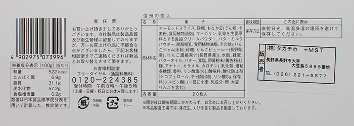 原材料/アーモンドスライス(アメリカ産)、砂糖、もなか皮(でん粉、小麦粉、食用植物油脂)、マーガリン、乳等を主要原料とする食品(クリームパウダー、植物油脂、たんぱく質濃縮ホエイパウダー、その他)、りんごジャム(水飴、砂糖、りんごピューレー(長野県産)、りんご濃縮果汁(長野県産))、水飴、蜂蜜、バターオイル、バター、食塩、卵黄粉末/着色料(紅麹、アナトー、カラメル、カロチン)、増粘多糖類、香料、乳化剤、酸味料、酸化防止剤(トコフェロール)、リン酸Ca、保存料(ソルビン酸)、(原材料の一部に小麦、乳成分、卵、アーモンド、大豆、りんごを含む)
