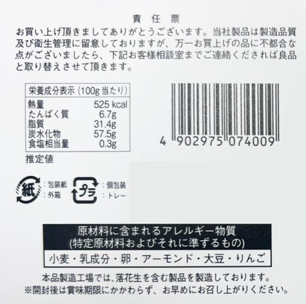 原材料/アーモンドスライス(アメリカ産)、砂糖、もなか皮(でん粉、小麦粉、食用植物油脂)、マーガリン、乳等を主要原料とする食品(クリームパウダー、植物油脂、たんぱく質濃縮ホエイパウダー、その他)、りんごジャム(水飴、砂糖、りんごピューレー(長野県産)、りんご濃縮果汁(長野県産))、水飴、蜂蜜、バターオイル、バター、食塩、卵黄粉末/着色料(紅麹、アナトー、カラメル、カロチン)、増粘多糖類、香料、乳化剤、酸味料、酸化防止剤(トコフェロール)、リン酸Ca、保存料(ソルビン酸)、(原材料の一部に小麦、乳成分、卵、アーモンド、大豆、りんごを含む)