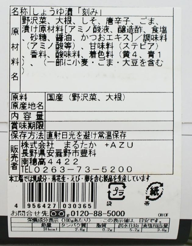 | 原材料 | 野沢菜、大根、しそ、唐辛子、ごま、漬け原材料(アミノ酸液、醸造酢、食塩、砂糖、醤油、かつおエキス)、調味料(アミノ酸等)、甘味料(ステビア)、香料、酸味料、着色料(黄4、青1)、(原材料の一部に小麦、大豆を含む) 製造工場では小麦、えび、落花生、乳、かにを使用した製品も製造しております。 |