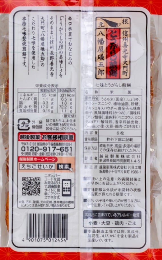 信州善光寺大門とうがらし煎餅八幡屋礒五郎×12袋(送料込)(信州長野県のお土産 お菓子 お取り寄せ スイーツ ギフト)