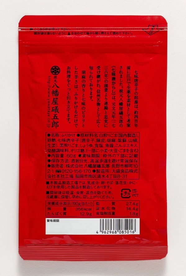 | 原材料 | 白ごま、七味唐辛子(唐辛子、陳皮、胡麻、紫蘇、山椒、生姜)、砂糖、黒ごま、しょうゆ、食塩、魚醤、こんぶエキス、発酵調味料、オリゴ糖(原材料の一部に小麦、大豆、ごまを含む) 製造工場では乳成分、卵、そば、落花生、かに、えびを使用した製品も製造しています |