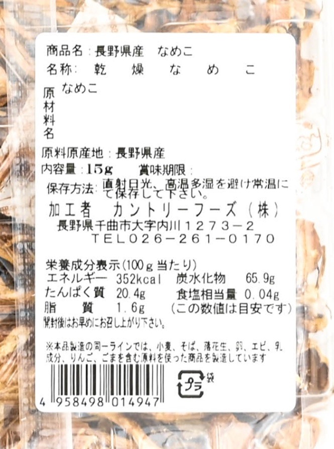 原材料/なめこ ※製造工場では、小麦、そば、落花生、卵、えび、乳成分、りんご、ごまを使った製品も製造しています