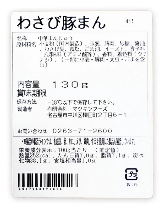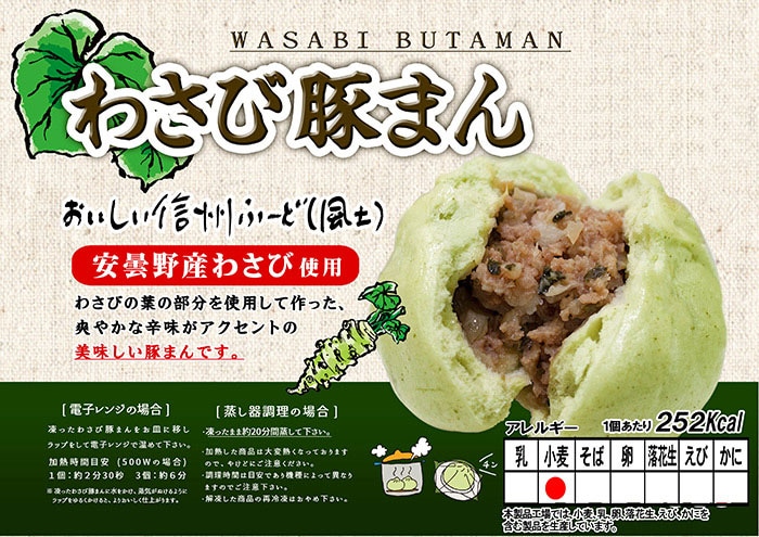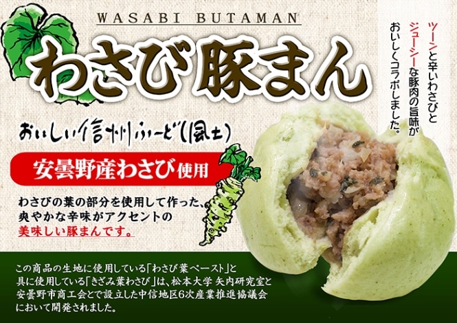 おいしい信州ふーど、安曇野産わさび使用、わさびの葉に部分を使用して作った爽やかな辛みがアクセントの美味しい豚まんです。
