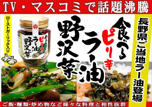 人気のお土産ラー油野沢菜は信州産の野沢菜と絶妙にマッチングしたラー油の香ばしさや食感が楽しめるお土産品で、テレビでも紹介されてさらに人気に!