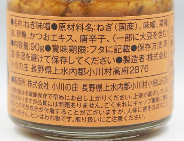 原材料/ねぎ(国産)、味噌、菜種油、砂糖、かつおエキス、唐辛子、(一部に大豆を含む)
