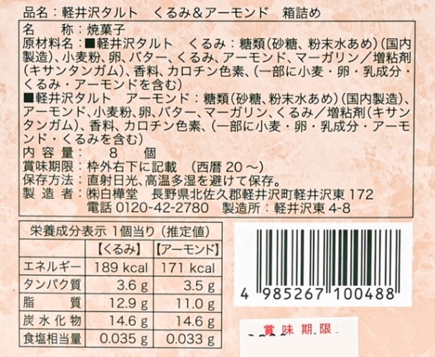| 原材料 | 糖類(砂糖、水飴)、小麦粉、卵、バター、アーモンド、マーガリン、くるみ、増粘剤(キサンタンガム)、香料、カロチン色素、(原材料の一部に大豆を含む) 製造工場ではそば、落花生、えび、かにを含む製品も製造しています。 |