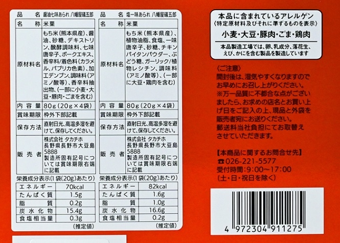 内容量/醤油七味あられ八幡屋礒五郎80g(20g×4)、塩一味あられ八幡屋礒五郎80g(20g×4)
