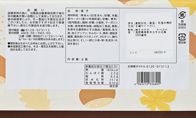 原材料/栗あん(白生あん、砂糖、水飴、栗ペースト(栗(小布施町産)、砂糖)、寒天)(国内製造)、鶏卵、砂糖、小麦粉、マーガリン、水飴、食用植物油脂、油脂加工食品、澱粉、乳等を主要原料とする食品/膨張剤、乳化剤、加工デンプン、セルロース、香料、増粘多糖類、着色料(フラボノイド、カロチン)、酸化防止剤(V.E)、(一部に小麦・卵・乳成分・大豆を含む)