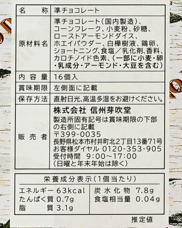 原材料/準チョコレート(国内製造)、コーンフレーク、小麦粉、砂糖、ローストアーモンドダイス、ホエイパウダー、白樺樹液、鶏卵、ショートニング、食塩/乳化剤、香料、カロチノイド色素、(一部に小麦、卵、乳成分、アーモンド、大豆を含む)