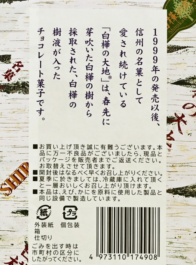 「白樺の大地」はミルクチョコレートにゴーフレットクラムをちりばめ、ホワイトチョコレートでコーティングしたチョコレート菓子。信州白樺の木をイメージして作ったお菓子です。