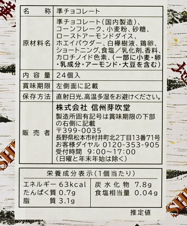 原材料/準チョコレート(国内製造)、コーンフレーク、小麦粉、砂糖、ローストアーモンドダイス、ホエイパウダー、白樺樹液、鶏卵、ショートニング、食塩/乳化剤、香料、カロチノイド色素、(一部に小麦、卵、乳成分、アーモンド、大豆を含む)