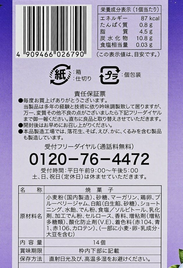 原材料/小麦粉(国内製造)、砂糖、マーガリン、鶏卵、ブルーベリージャム、白餡(白生餡、砂糖)、ショートニング、水飴、でん粉、食塩/ソルビトール、乳化剤、加工でん粉、セルロース、香料、増粘剤(増粘多糖類)、酸化防止剤(V.E)、着色料(赤104、青1、赤106、カロテン)、(一部に小麦・卵・乳成分・大豆を含む)
