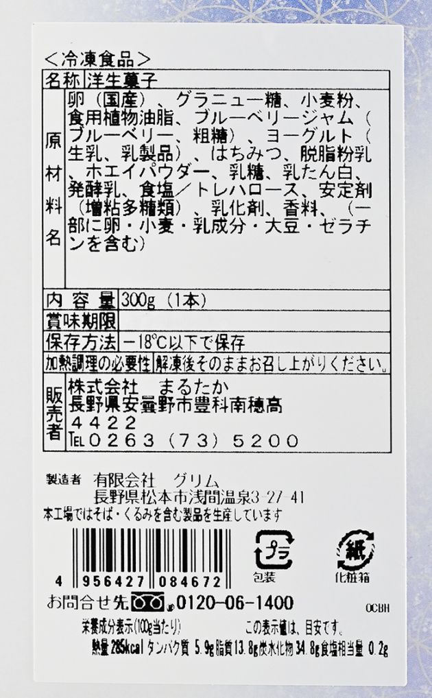 原材料/卵(国産)、グラニュー糖、小麦粉、食用植物油脂、ブルーベリージャム(ブルーベリー、粗糖)、ヨーグルト(生乳、乳製品)、はちみつ、脱脂粉乳、ホエイパウダー、乳糖、乳たん白、発酵乳、食塩/トレハロース、安定剤(増粘多糖類)、乳化剤、香料、(一部に卵、小麦、乳成分、大豆、ゼラチンを含む)