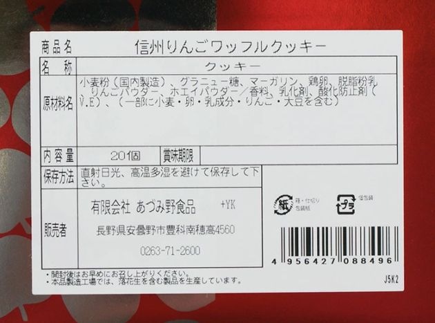 信州産りんご100%使用。サクサクの食感と甘酸っぱいりんごの風味の信州りんごワッフルクッキー。信州のりんごの生産者と松本大学(矢内研究室)、有限会社あずみ野食品による共同開発商品です