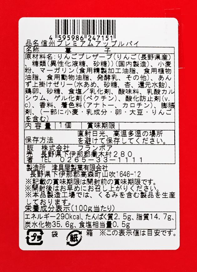 原材料/りんごプレザーブ(りんご(長野県産)、糖類(異性化液糖、砂糖))(国内製造)、小麦粉、マーガリン(食用精製加工油脂、食用植物油脂、発酵乳、その他)、あんず上掛けゼリー(水あめ、砂糖、杏、還元水飴)、鶏卵、砂糖、食塩/乳化剤、酸味料、乳酸カルシウム、ゲル化剤(ペクチン)、酸化防止剤(V.C)、香料、着色料(アナトー、カロチン)、膨張剤、(一部に小麦、乳成分、卵、大豆、りんごを含む)