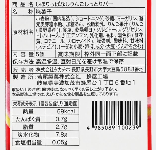 原材料/小麦粉(国内製造)、ショートニング、砂糖、マーガリン、還元麦芽糖水飴、加糖あん、脱脂粉乳、りんご果汁(りんご(長野県産))、食塩、乾燥卵白/ソルビトール、グリセリン、トレハロース、加工デンプン、乳化剤、香料、着色料(紅花黄、コチニール、カロテノイド)、膨張剤、酸味料、甘味料(ステビア)、(一部に小麦、卵、乳成分、大豆、りんごを含む)