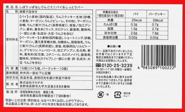 【バークッキー】小麦粉(国内製造)、ショートニング、砂糖、マーガリン、還元麦芽糖水飴、加糖あん、脱脂粉乳、りんご果汁(りんご(長野県産))、食塩、乾燥卵白/ソルビトール、グリセリン、トレハロース、加工デンプン、乳化剤、香料、着色料(紅花黄、コチニール、カロテノイド)、膨張剤、酸味料、甘味料(ステビア)、(一部に小麦、卵、乳成分、大豆、りんごを含む)