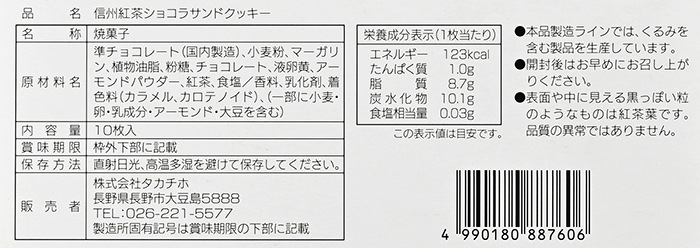 信州産和紅茶茶葉100%使用、紅茶風味のクッキー生地で紅茶風味のショコラをサンドしました。クッキー生地とショコラの両方に信州産の和紅茶の茶葉を練り込んだ贅沢なクッキーです。口の中いっぱいに広がる芳醇な紅茶の香りをお楽しみください