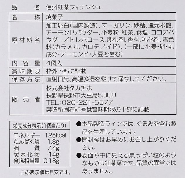 原材料/加工卵白(国内製造)、マーガリン、砂糖、還元水飴、アーモンドパウダー、小麦粉、紅茶、食塩、ココアパウダー/トレハロース、膨張剤、香料、乳化剤、着色料(カラメル、カロテノイド)、(一部に小麦、卵、乳成分、アーモンド、大豆を含む)