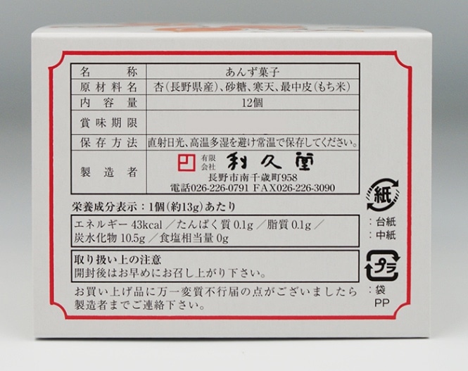 | 原材料 | 杏、砂糖、寒天、もち米(種菓子) |