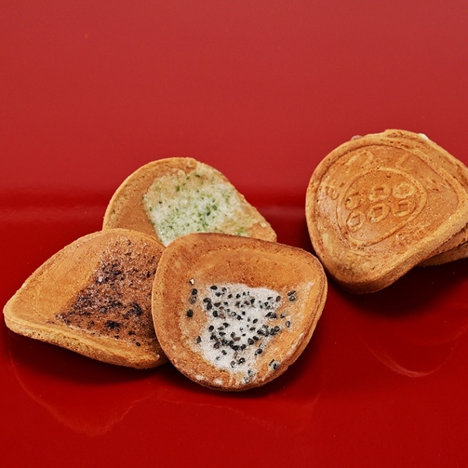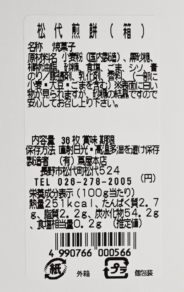 原材料/小麦粉(国内製造)、黒砂糖、植物油脂、砂糖、食塩、ごま、シソ、青のり/膨張剤、乳化剤、香料、(一部に小麦、大豆、ごまを含む)