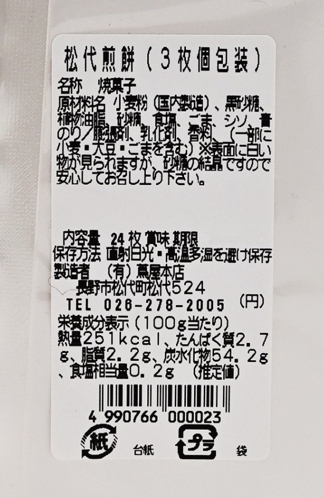 原材料/小麦粉(国内製造)、黒砂糖、植物油脂、砂糖、食塩、ごま、シソ、青のり/膨張剤、乳化剤、香料、(一部に小麦、大豆、ごまを含む)