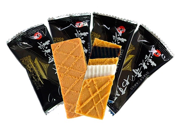 信州善光寺の参拝記念のお土産にいかがですか? サクッとしたウェハースにチョコクリームとホワイトクリームのダブルサンド! サクサクとした食感のお菓子です