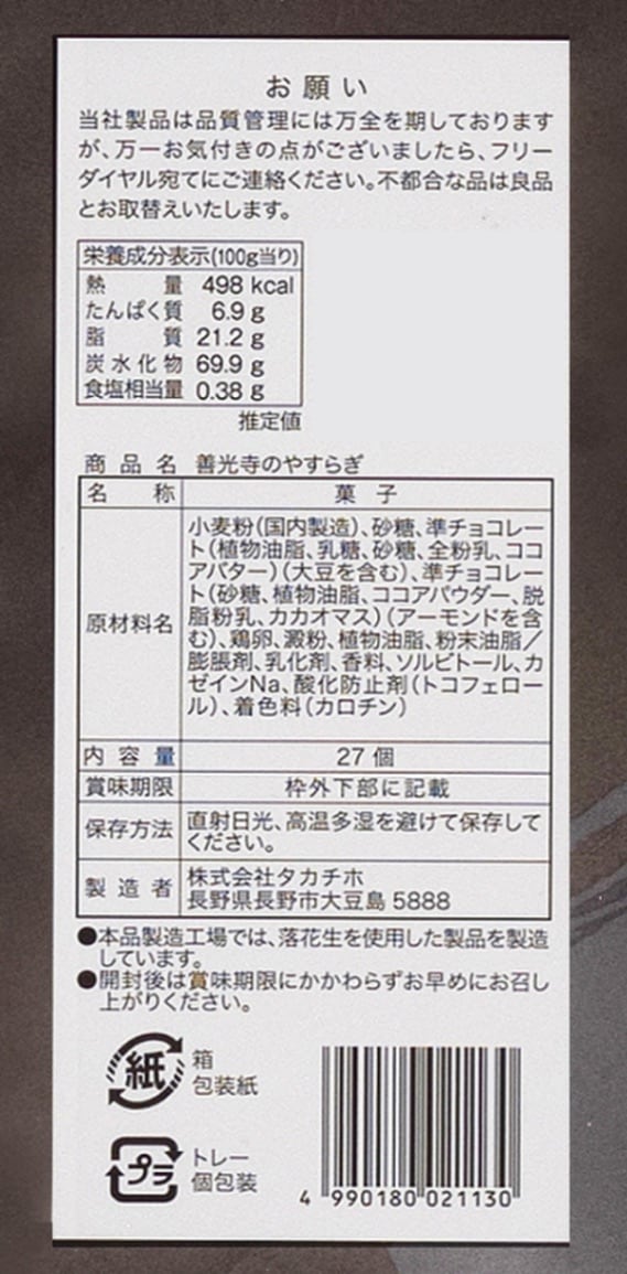 | 原材料 | 砂糖、小麦粉、植物油脂、鶏卵、乳糖、でん粉、全粉乳、ココアパウダー、ココアバター、カカオマス、コーンシロップ、膨張剤、乳化剤、ソルビトール、香料、カゼインNa、酸化防止剤(トコフェロール)、着色料(カロチン)、(原材料の一部に大豆を含む) 製造工場ではそば、落花生を使用した製品も製造しています。 |