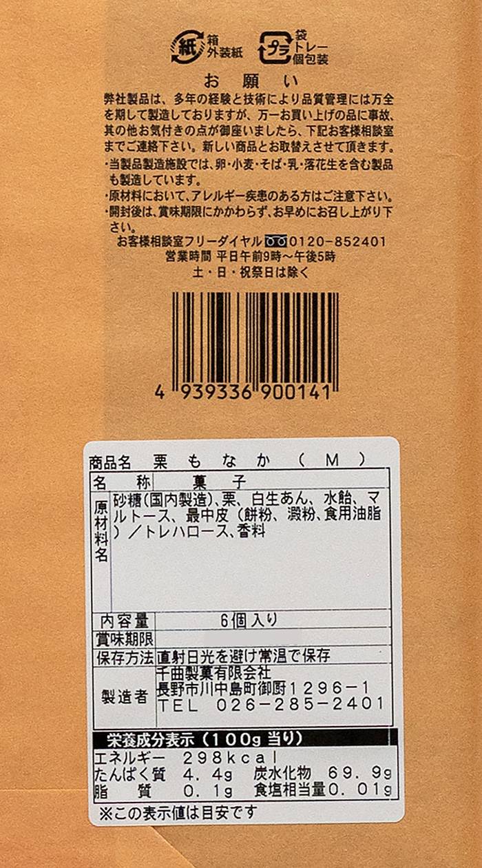 | 原材料 | 栗、砂糖、水飴、マルトース、白生あん、最中種(餅粉、澱粉)、トレハロース 製造工場では卵、小麦、そば、乳、落花生を含む製品も製造しております |
