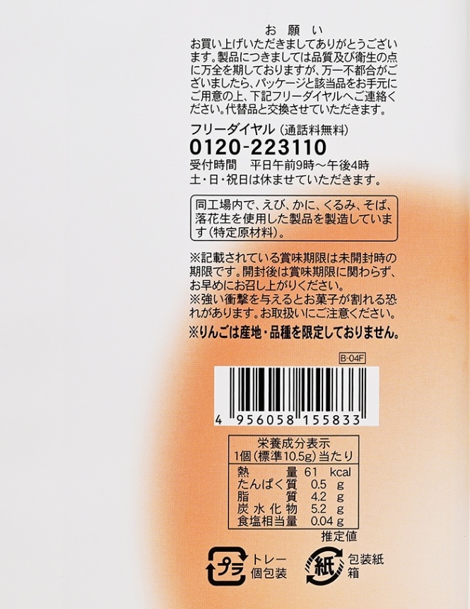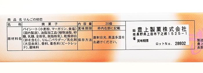 原材料/パイシート(小麦粉、マーガリン、食塩)(国内製造)、油脂加工品(植物油脂、砂糖、乳糖、全粉乳、脱脂粉乳)、乾燥卵白(卵を含む)、りんごパウダー/乳化剤(大豆由来)、香料、着色料(ビートレッド)、酸味料