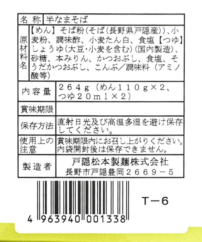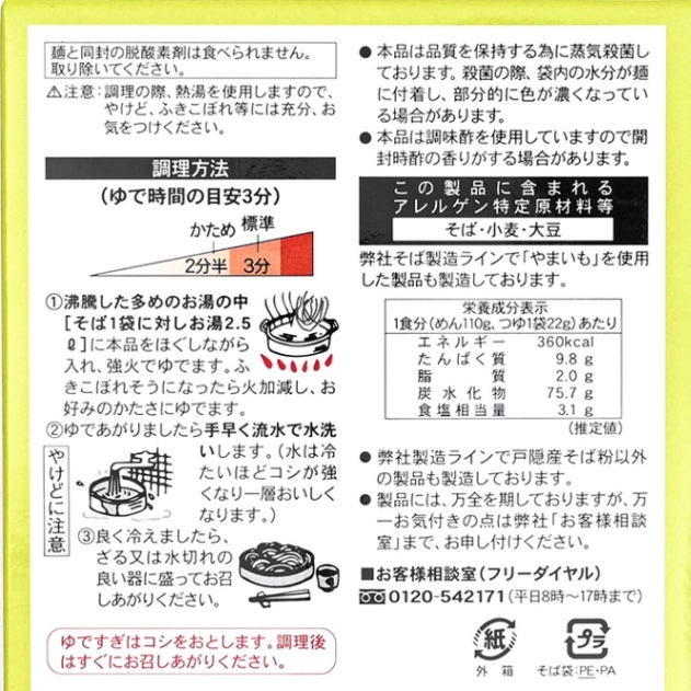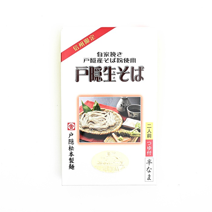 | 原材料 | 【めん】そば粉、小麦粉、調味酢、小麦たん白、食塩 【添付調味料】しょうゆ(本醸造)、砂糖、みりん、かつおぶし、食塩、そうだかつおぶし、こんぶ、調味料(アミノ酸等)、(原材料の一部に小麦を含む) 製造工場ではやまいも、戸隠産そば粉以外の製品も製造しています |