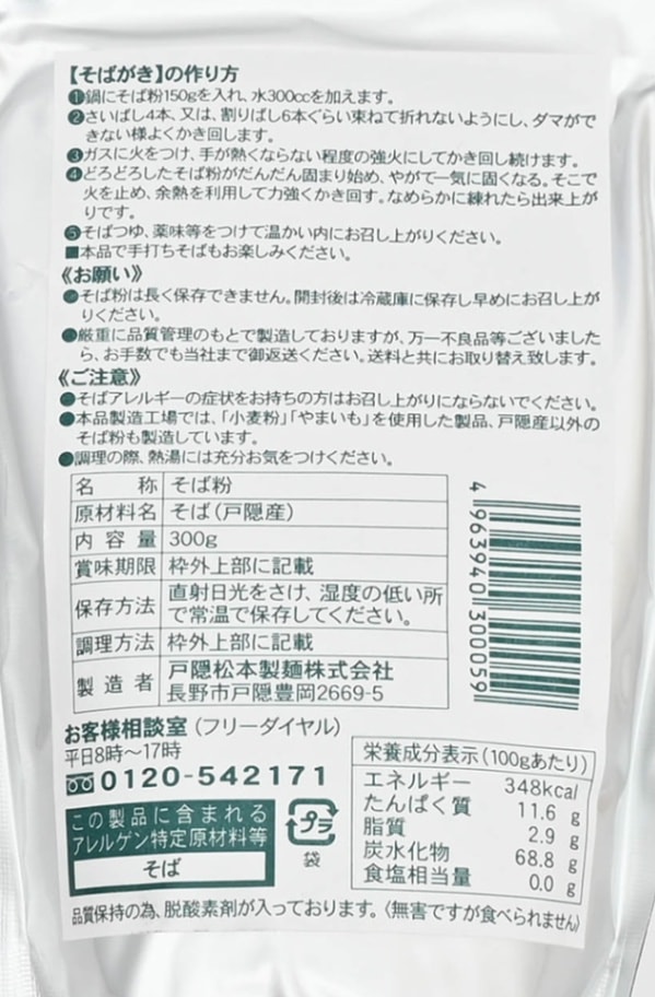 | 原材料 | 玄そば 製造工場では小麦粉、やまいもを使用した製品、戸隠産以外のそば粉も製造しています。 |