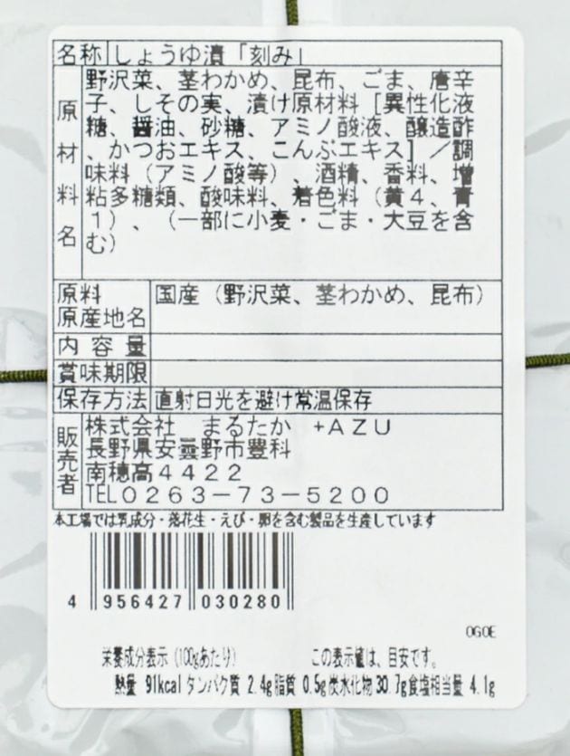 | 原材料 | 野沢菜(国産)、茎わかめ(国産)、昆布(国産)、ごま、唐辛子、しその実、漬け原材料(異性化液糖、醤油、砂糖、アミノ酸液、醸造酢、かつおエキス、こんぶエキス)、調味料(アミノ酸等)、酒精、香料、増粘多糖類、酸味料、着色料(黄4、青1)、(原材料の一部に小麦、大豆を含む) 製造工場では小麦、えび、落花生、乳、かにを含む製品も生産しています。 |